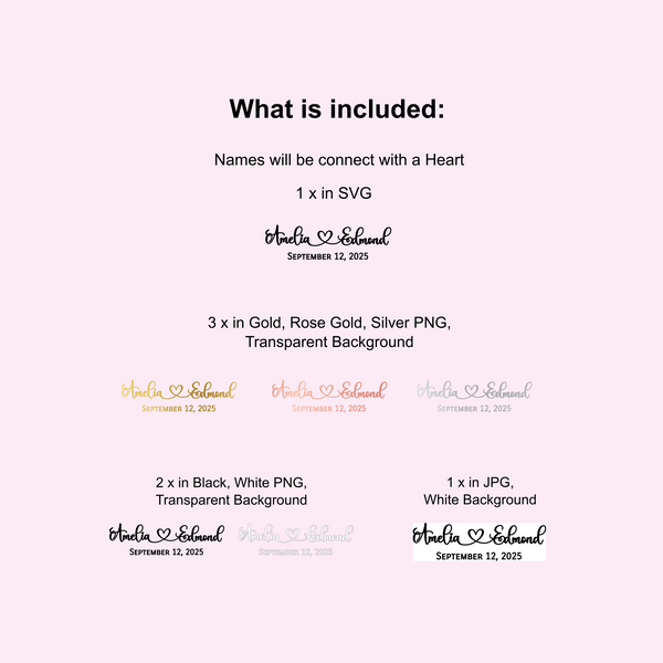 This specially designed a Custom Names connected with Heart and Date digital files is prefect for you and your loved ones' big day and all your crafting needs! You can make signs, t-shirts, decorations and more!